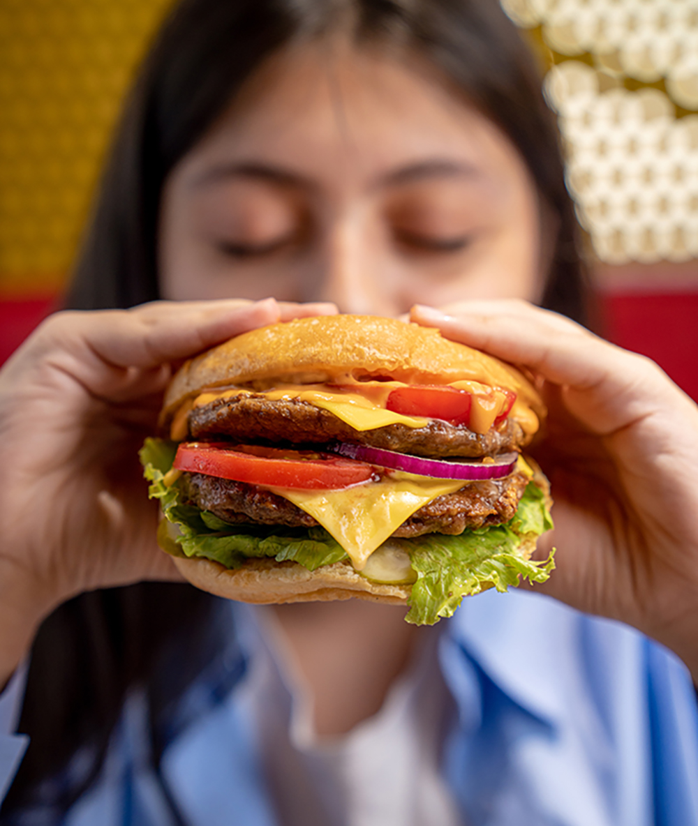 Yumshoq bulochka, maxsus sous, aysberg salati, tuzlangan bodring, 2ta barra mol goshtidan kotlet, pomidor, pishloq, Brunsvik shirin piyoz halqalari